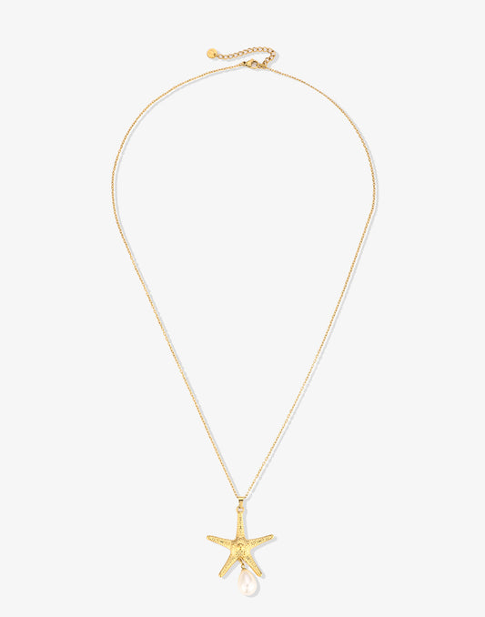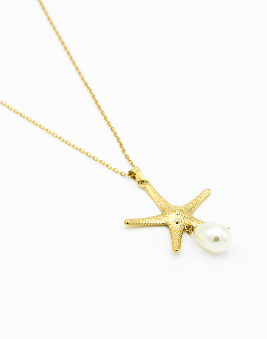 - Lange goudkleurige ketting met zeester en parel hanger