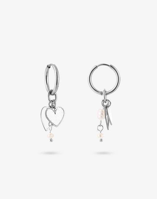 Oorringen dubbel hartjes parel zilverkleurig