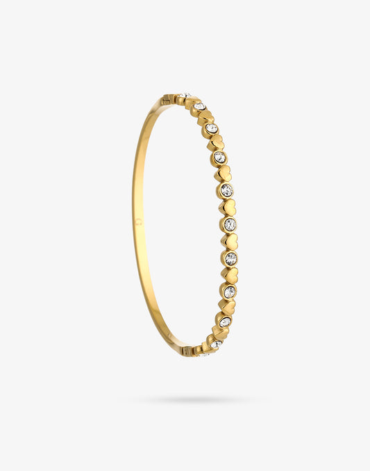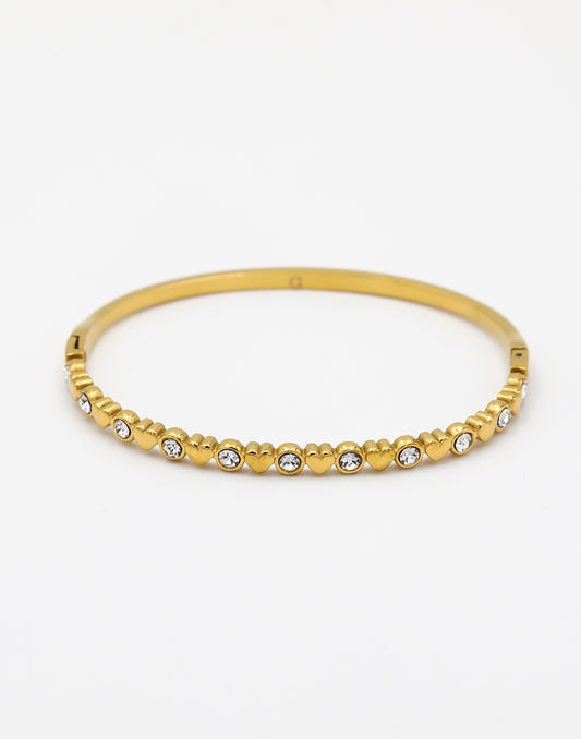 - Goudkleurige bangle met hartjes en ronde steentjes