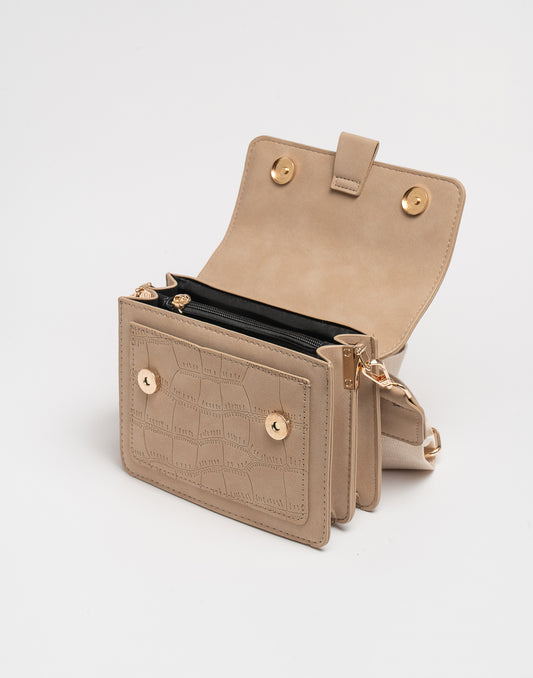 De tas is afgewerkt met stijlvolle goudkleurige accenten die zorgen voor een chique contrast met het beige faux suede. Met compacte afmetingen van 14x19x6cm biedt deze crossbody tas voldoende ruimte voor je essentials zoals telefoon, portemonnee en sleutels, zonder onnodig volume.