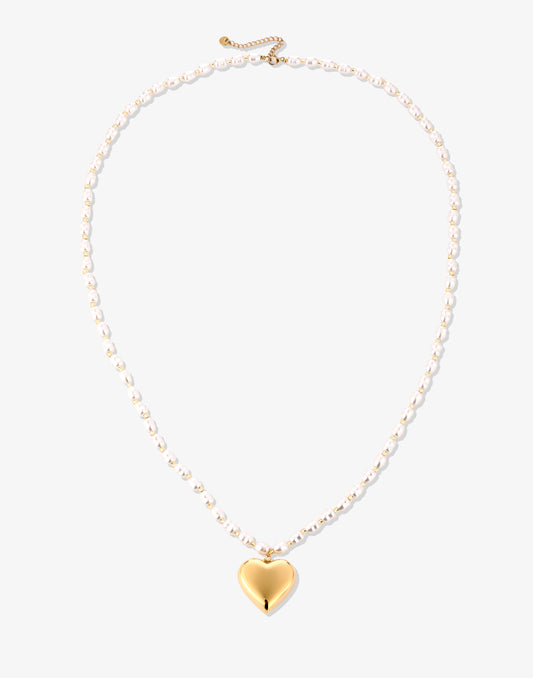 - Lange ketting met kleine parels, goudkleurige kralen en hart hanger