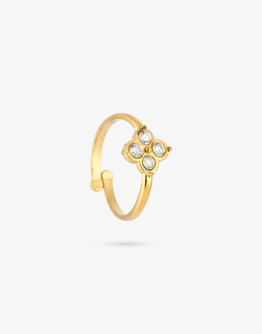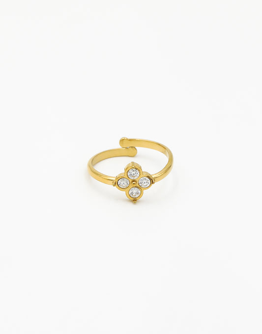 - Goudkleurige ring in klaver-vorm met ronde steentjes