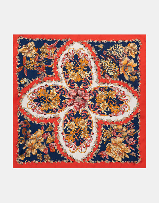 Deze zijdezachte vierkante sjaal in navy combineert stijl met comfort. Het elegante bloemenmotief en de glanzende stof geven elk outfit een luxe uitstraling. Perfect voor elke gelegenheid, van casual dagelijks gebruik tot chique avondlooks.